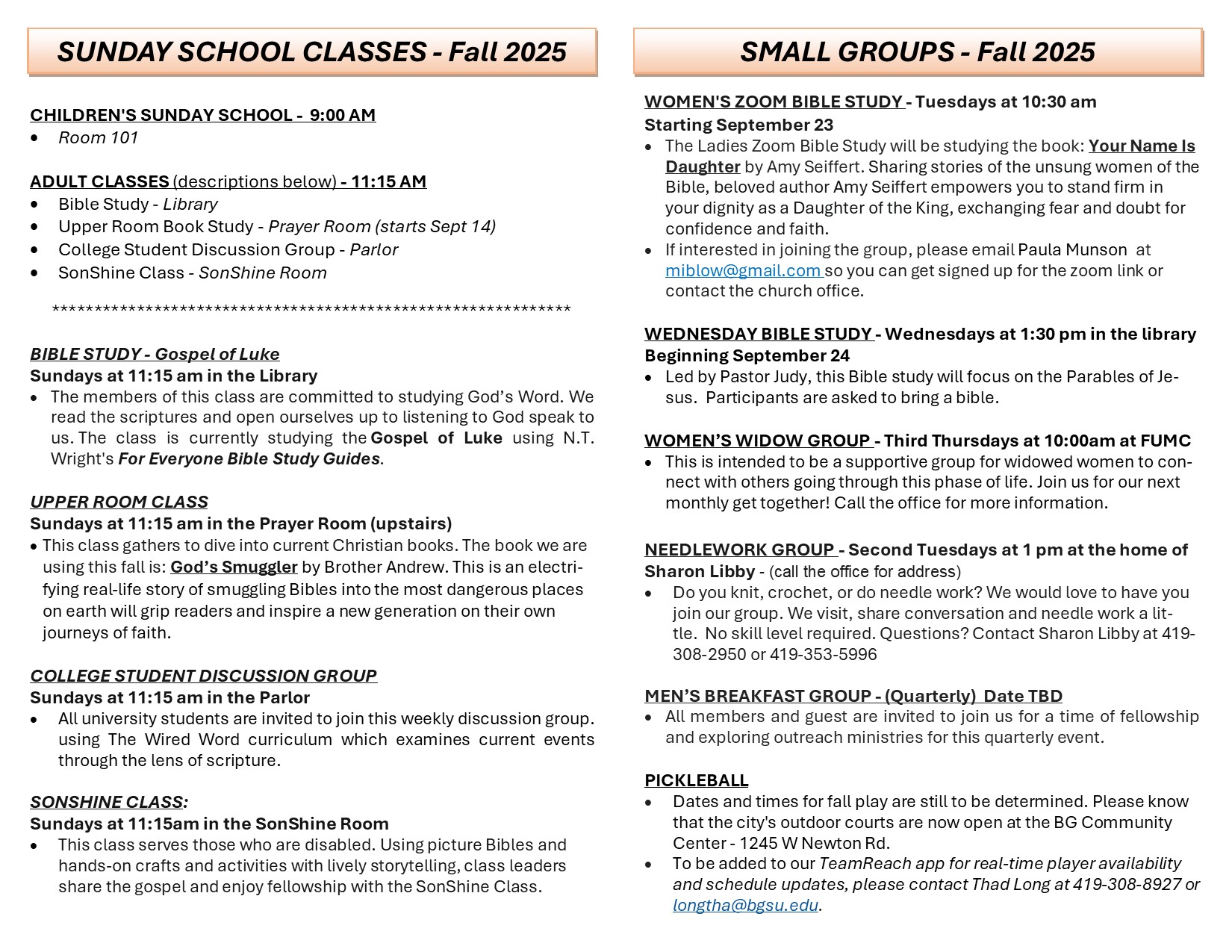 Each Sunday Morning from Sept - May we have Sunday classes available for you to connect and grow. Classes are available for PK-adult. Offerings vary from book studies, bible studies, discussion on how faith and current events connect. See the list below and click "LEARN MORE" for a description of each adult class.