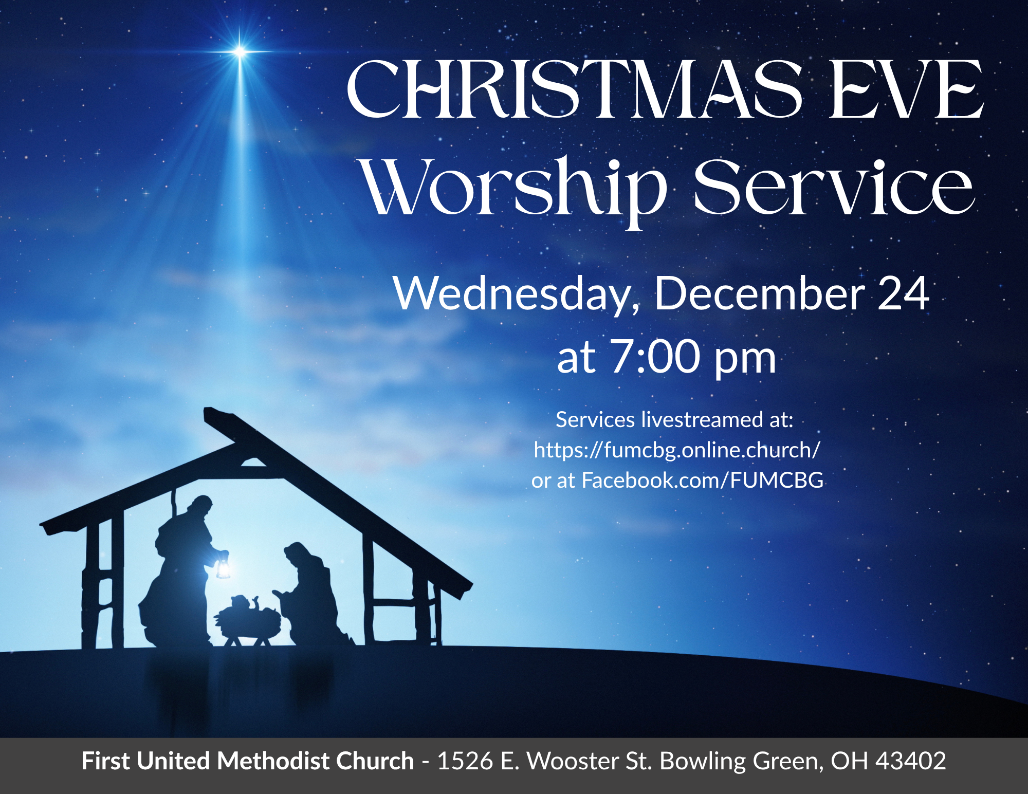 Christmas Eve Worship Service All are welcome to join us for our Christmas Eve worship Service, December 24th at 7:00 pm Services can also be livestreamed at https://fumcbg.online.church/ + Add to Google Calendar + iCal / Outlook export The event is finished. Date Dec 24 2025 Expired! Time 7:00 pm Location First United Methodist Category Community Event Worship Service Share this event
